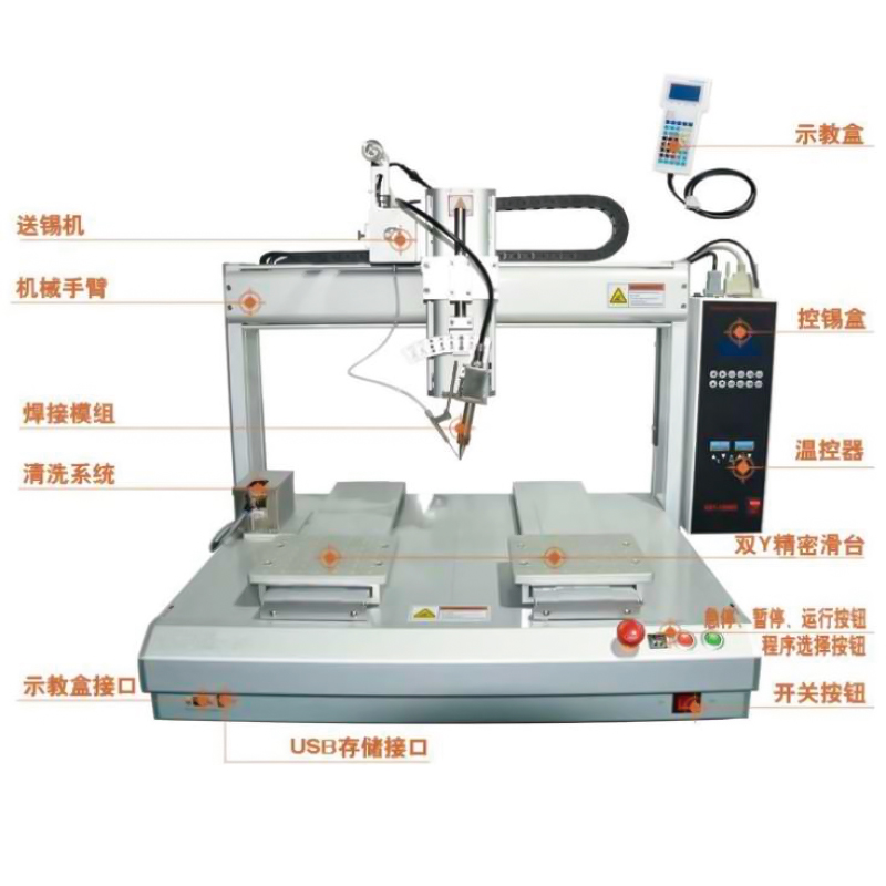 可以通过外部I/0接口,实现焊锡机器人对外围设备的实时控制。智能化的控制系统, 执行错误报警、高速运动防震等功能。智能化的主控程序,实现焊锡过程的自动化和智能化。